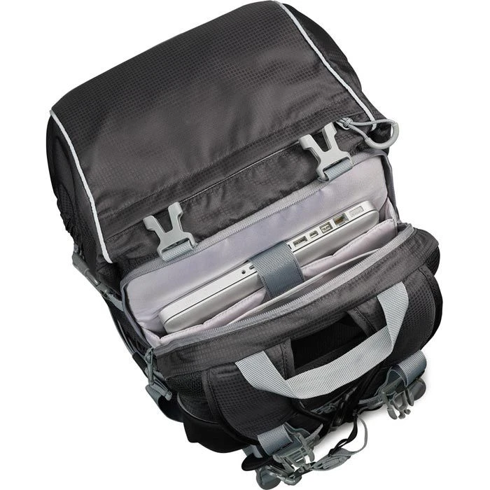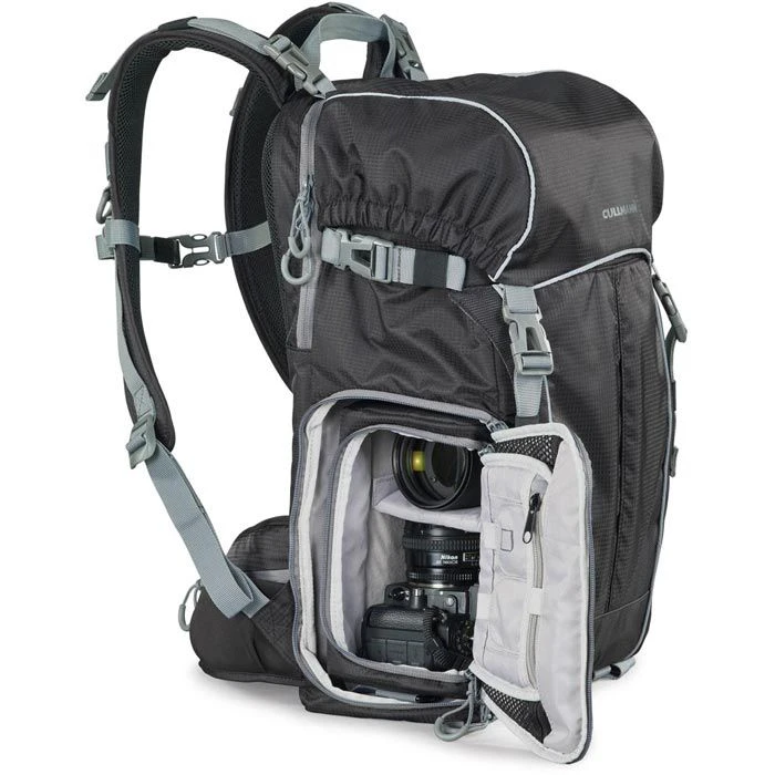 sonstiges: ideal geeignet für professionelle Fotografen auf Reisen, kompakte Bauweise erlaubt Aufgabe als Handgepäck bei vielen Fluggesellschaften, Öffnung des gepolsterten Kamerafachs vom Rücken aus, direkter Kamerazugriff über seitliche Öffnung, DayPack-Fach für weiteres Zubehör oder Kleidung am oberen Teil des Rucksacks, Klappe an der Vorderseite für beispielsweise Jacke oder Fahrradhelm, herausnehmbare Schultertasche, zusätzliche Tasche für Smartphone und Wertsachen, seitliche Netztasche mit Gummizug für zum Beispiel Trinkflasche, gepolsterte und längenverstellbare Schultergurte, reflektierende Streifen für bessere Sichtbarkeit, integrierte Aluminiumschiene ist individuell anpassbar und sorgt für Tragekomfort und Stabilität, lückenlose Regenhülle, Stativbefestigung an der Unterseite