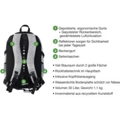 • Reflektierende Leuchtstreifen am Rucksack und den Trägern