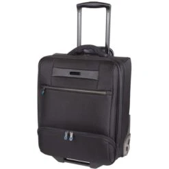 sonstiges: zwei geräumige Hauptfächer, eins davon mit Laptopfach, drei Stiftschlaufen, sechs Einsteckfächer und ein Handyfach, das andere mit Overnight-Funktion und Befestigungsriemen, zwei Reißverschlussvortaschen, ein weiteres kleines Reißverschlussfach im Inneren, verdecktes Adressfeld auf der Rückseite, ergonomischer Tragegriff, Teleskopstange mit mehreren Längenstufen, mit zwei Präzisionslaufrollen