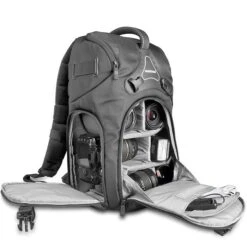 sonstiges: ideal geeignet für professionelle Fotografen auf Reisen, kompakte Bauweise erlaubt Aufgabe als Handgepäck bei vielen Fluggesellschaften, vielseitige Verwendung durch 5 frei platzierbare Trennwände im Innenfach, oberes Fach für Wertsachen lässt sich mit dem Hauptfach verbinden, atmungsaktive Airmesh-Polsterung am Rücken, gepolsterte, atmungsaktive und längenverstellbare Schultergurte, zusätzlicher Bauchgurt sorgt für Entlastung bei hoher Traglast, mit wenigen Handgriffen auf Eingurtsystem umstellbar, lückenlose Regenhülle, Stativhalterung an der Unterseite für große Stative geeignet